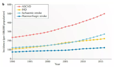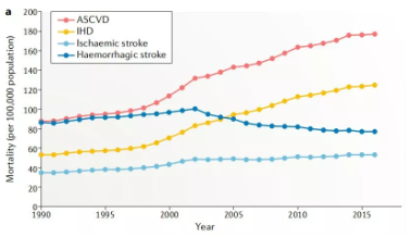 腦卒中、冠心病等心血管疾?。–ardiovascular disease,CVD)是造成我國居民死亡和疾病負(fù)擔(dān)的首要病因,占中國死亡人口的40%,CVD發(fā)病率呈現(xiàn)逐年快速攀升的趨勢,目前我國CVD患者超過 2.9 億例。動脈硬化性心血管疾?。ˋtherosclerotic cardiovascular disease,ASCVD)是一種單一類型的心血管疾病,包括缺血性卒中(Ischaemic stroke)和缺血性心臟病(Ischaemic heart disease,IHD)。從1990年至2016年,ASCVD的死亡人口增加近100萬,據(jù)統(tǒng)計2016年約有240萬人死于ASCVD,占CVD總死亡人口的61%,占所有死亡的25%。