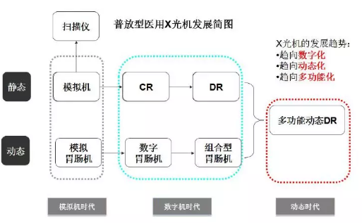 在靜態(tài)成像層面,X光機(jī)的發(fā)展經(jīng)歷了模擬機(jī)、CR、DR三個(gè)階段,成像速度越來(lái)越快,成像質(zhì)量越來(lái)越高。