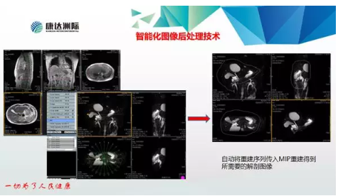 康達(dá)“智速”磁共振采用的智能化圖像后處理技術(shù)無(wú)需人工干預(yù),自動(dòng)將重建序列傳入MIP重建得到所需要的解剖圖像。在AI技術(shù)助力下,能完成五期動(dòng)態(tài)增強(qiáng),單期掃描時(shí)間僅需15秒。
