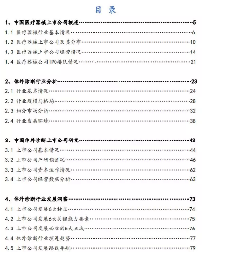 ●體外診斷行業(yè)分析:包括了產(chǎn)業(yè)發(fā)展歷程,產(chǎn)品分類,上下游產(chǎn)業(yè)鏈分析,總體市場規(guī)模和格局,生化、免疫、分子、 POCT細(xì)分領(lǐng)域規(guī)模和格局、產(chǎn)業(yè)驅(qū)動因素,產(chǎn)業(yè)發(fā)展機會和技術(shù)生命周期,宏觀發(fā)展的政治、經(jīng)濟(jì)、社會和技術(shù)環(huán)境。