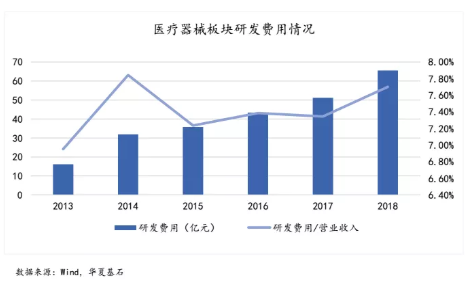 近年我國醫(yī)療器械上市公司的研發(fā)投入和人員占比持續(xù)增長,反映了醫(yī)療器械行業(yè)發(fā)展進(jìn)程對國內(nèi)企業(yè)的研發(fā)提出了越來越高的要求,行業(yè)逐步由銷售驅(qū)動,轉(zhuǎn)向研發(fā)和銷售雙輪驅(qū)動。但總量依然不足,2018年我國所有醫(yī)療器械上市公司公司的研發(fā)投入總和為65.5億元人民幣,不及1家跨國公司投入。(美敦力在2018年研發(fā)總投入為22.53億美元)