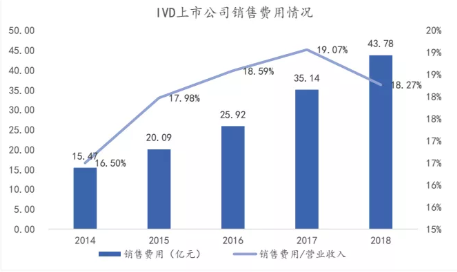 近年,我國IVD上市公司銷售費用和銷售費用/營業(yè)收入從2014年15.5%逐年上漲至2017年的19%,在“兩票制”政策的推動下,2018年銷售費用營收比略有下滑。與我國醫(yī)藥公司“輕研發(fā)、重銷售” 動輒50%甚至60%的銷售費用營收比相比,占比相對較低。多數(shù)企業(yè)經(jīng)銷為主,直銷為輔。不同類型企業(yè)銷售費用占比差異巨大,傳統(tǒng)生化診斷企業(yè)利德曼、九強生物、美康生物等歷年銷售費用營收占比基本低于15%,其他企業(yè)大都維持在15%到23%之間,而艾德生物和凱普生物兩家分子診斷企業(yè)由于采取直銷方式,銷售費用為40%。