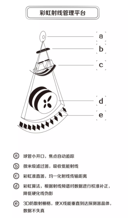 b、動(dòng)態(tài)三維變焦球管---8MHU飛焦點(diǎn)金屬球管,配合全息微晶元探測器實(shí)現(xiàn)221184有效采樣通道,降低偽影,獲得全息高清數(shù)據(jù)影像。