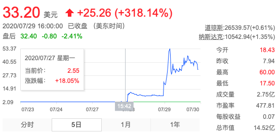 7月29日晚,美股市場上,柯達(dá)的股價再度暴漲逾318%,盤中20次觸發(fā)熔斷,一度漲至59.98美元的高點,漲超650%,創(chuàng)7年新高。從7月27日開盤2.13美元到29日收盤33.20美元,3天累計上漲1480%,市值暴增13.6億美元。