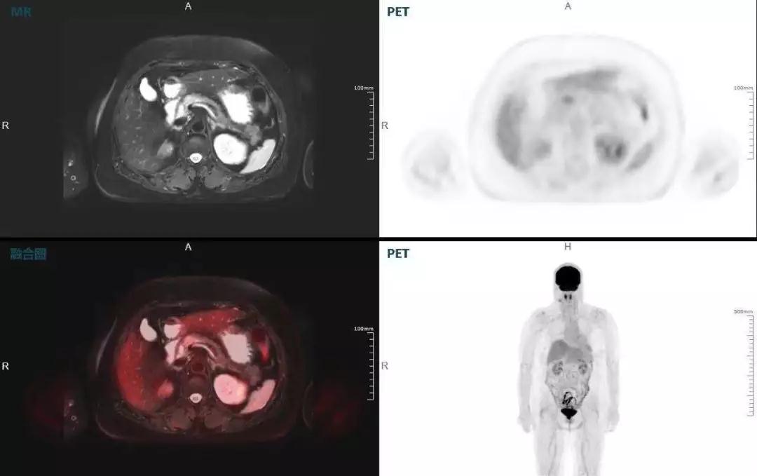 (胰腺腫瘤,MR顯示胰腺體部信號(hào)異常,PET顯示稍高攝取,結(jié)構(gòu)改變和功能異常提示胰腺M(fèi)T可能大。)