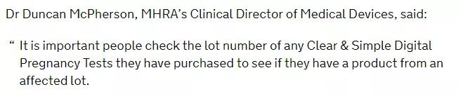 譯:MHRA醫(yī)療器械的臨床主任鄧肯·麥克弗森博士說:人們要重點檢查他們購買的任何清晰和簡單的數(shù)字妊娠測試的批號,看看他們是否有來自受影響批號的產品。