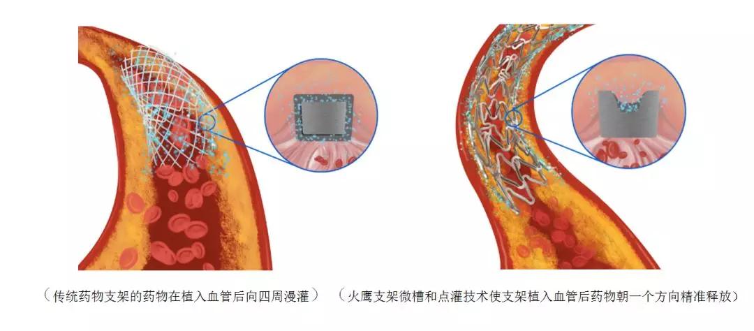 怎樣把藥物完美地“保存”在支架上?經(jīng)過(guò)反復(fù)設(shè)計(jì)和比較,火鷹研發(fā)團(tuán)隊(duì)歷時(shí)15年,選擇并達(dá)成了技術(shù)上最難實(shí)現(xiàn)的一種方案——微槽包裹藥物,即在金屬支架表面用激光刻槽,再把藥物灌入槽內(nèi)。和傳統(tǒng)技術(shù)的區(qū)別在于,刻槽可防止涂層在輸送過(guò)程中脫落,藥物不會(huì)流失,且藥物抵達(dá)血管病變區(qū)后,能通過(guò)固定的槽位精準(zhǔn)釋放,大幅提高了有效性,也避免了浪費(fèi)。