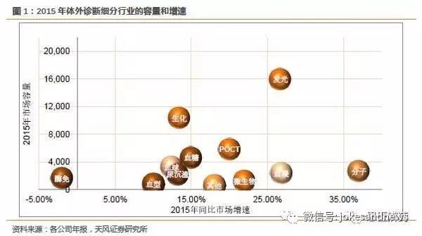 由上圖看出,從市場(chǎng)容量和行業(yè)增速兩個(gè)維度來看,化學(xué)發(fā)光細(xì)分具有良好的投資價(jià)值潛質(zhì)。2015年化學(xué)發(fā)光市場(chǎng)容量160億,占整個(gè)體外診斷行業(yè)30%以上,2015年行業(yè)增速27%,未來3-5年仍具備較高的行業(yè)景氣度。