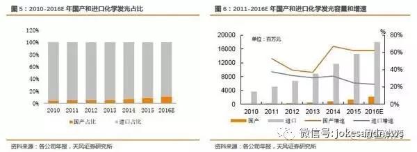 2016年化學(xué)發(fā)光市場(chǎng)容量接近200億,國產(chǎn)占比不到20億,但是只考慮總的市場(chǎng)容量是不合理的,因?yàn)橐阅壳皣a(chǎn)水平難以和進(jìn)口競(jìng)爭(zhēng),所以我們分析市場(chǎng)有效空間。