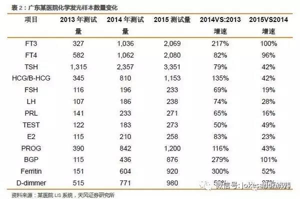 廣東省某基層醫(yī)院,一級(jí)甲等,2014年檢驗(yàn)科收入約為1000萬。2013年開始使用國產(chǎn)全自動(dòng)發(fā)光儀,開展項(xiàng)目主要為甲功、激素兩個(gè)套餐。2015-2013年樣本增量變化如下。