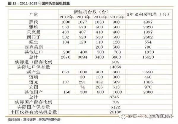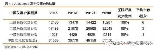 根據(jù)以上邏輯,我們大致可以測(cè)算目前的存量市場(chǎng),發(fā)光還未完全滿足終端需求,2015年儀器保有量來看,只滿足了60%的需求。而未來需求端的增長(zhǎng)依然保持極高的增速,除了進(jìn)口企業(yè),少量國產(chǎn)優(yōu)秀品牌可以分享藍(lán)海市場(chǎng),儀器裝機(jī)依然有很大的空間待開發(fā)。