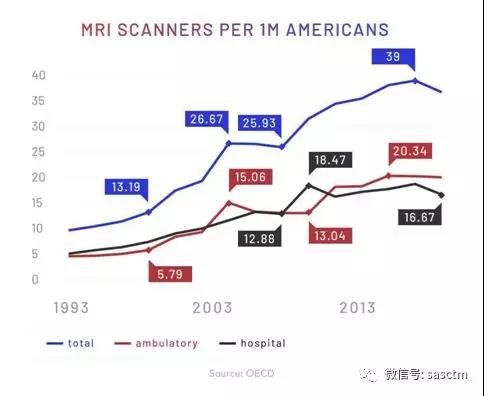 根據(jù)經(jīng)濟(jì)合作與發(fā)展組織(OECD)的數(shù)據(jù):1993年,美國每百萬人的核磁共振掃描儀擁有量不到10臺。2004年,這一數(shù)字飆升至27臺;而到2015年,數(shù)量已高達(dá)39臺。