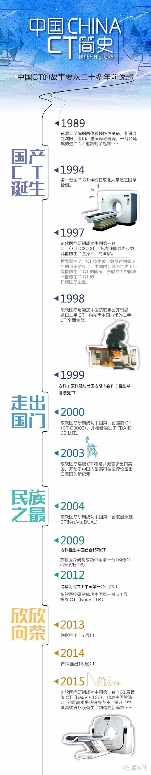 中國第一臺自主研制的CT樣機(jī)面世,標(biāo)志著中國成為世界上第四個能夠自行設(shè)計(jì),生產(chǎn)全身CT的國家。