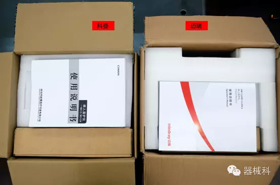 一般來說,產品的說明書都大同小異,幾乎沒有太大的差別。科曼的說明書看得出來是經過簡約的設計,是市面上常見的中規(guī)中矩的黑白風格,而邁瑞獨樹一幟的設計,倒是讓人眼前一亮,忍不住多看幾眼。雖然兩者用的是同一種紙張,效果卻大不相同。