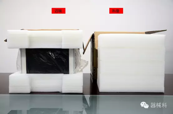 在儀器包裝上,科曼NC12和IPM12都是采用珍珠棉進行包裝,但科曼NC12采用360°無死角的全包裹方式,雖然看起來臃腫,但是更能保證儀器在運輸途中的安全;邁瑞IPM12采用半包裹的方式,看起來簡潔清爽,但存在一定的安全隱患。