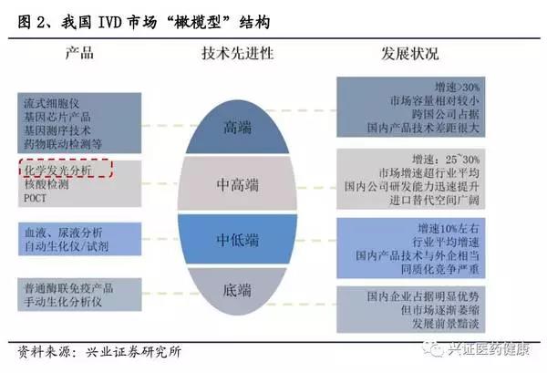 產(chǎn)品結(jié)構(gòu)上,我國體外診斷行業(yè)總體呈現(xiàn)“橄欖型”結(jié)構(gòu):低端市場是前期廣泛使用的檢驗技術(shù),發(fā)展空間小,增速緩慢,正在進行方法學(xué)上的更新和迭代;中端市場由于近幾年國產(chǎn)研發(fā)能力迅速提升,渠道優(yōu)勢明顯,國內(nèi)產(chǎn)品正在處在高速發(fā)展階段;高端市場由于技術(shù)壁壘高,國內(nèi)外差異大,主要為國外產(chǎn)品,國內(nèi)產(chǎn)品目前在研發(fā)潛伏期,未來將迎來增長。