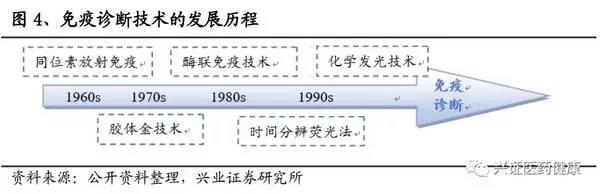 免疫診斷的發(fā)展需要依靠免疫學(xué)技術(shù)的不斷革新,免疫診斷的變革依次經(jīng)歷了放射免疫檢驗(RIA)、膠體金快速檢驗、酶聯(lián)免疫檢驗(ELISA)、時間分辨熒光免疫(TRFIA)的迭代,最終迎來了化學(xué)發(fā)光免疫檢驗(CLIA)的時代。