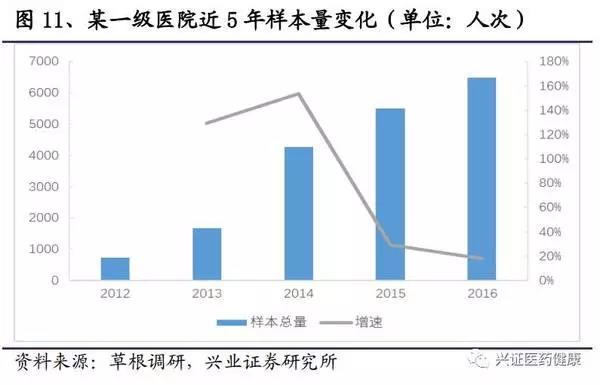 以某第三方檢驗中心為例,其發(fā)光樣本主要來自一、二級未開展發(fā)光檢驗的醫(yī)院和三級醫(yī)院本身檢驗科超承載量的部分。根據(jù)銷售數(shù)據(jù),在送檢的三個級別醫(yī)院中各抽12家穩(wěn)定送檢醫(yī)院可見,總體樣本量呈增長趨勢,其中,一二級醫(yī)院檢驗樣本數(shù)量快速增長,在2017年三級醫(yī)院樣本量有所下降,其可能原因,一是醫(yī)院新購發(fā)光儀器可承載更多的樣本檢測,二是由于分級診療的效果顯現(xiàn),三級醫(yī)院的樣本檢驗量下調(diào)。