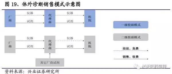 醫(yī)院是產(chǎn)業(yè)鏈上最強勢的一環(huán),國產(chǎn)產(chǎn)品對醫(yī)院的吸引力決定著國產(chǎn)替代進程。在銷售模式上,公司多采用直銷和經(jīng)銷相結(jié)合,以經(jīng)銷為主。對于醫(yī)院終端,儀器基本以投放獲得,廠商以搭配銷售試劑的方式獲得收益。體外檢測等醫(yī)療服務(wù)由政府統(tǒng)一定價,應(yīng)用化學(xué)發(fā)光法可相應(yīng)提高收費標(biāo)準(zhǔn)(例如:福建省用化學(xué)發(fā)光法可加價80%)。因此,試劑屬于醫(yī)院的“成本項”,醫(yī)院有動力對檢測方法進行升級迭代,但卻并沒有動力去特意抬高價格,在相同條件下會考慮試劑性價比,相對市場化。