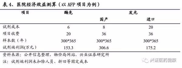由于儀器是通過投放的形式進駐醫(yī)院,從醫(yī)院端只需要計算試劑成本。以上測算可得出,此醫(yī)院若用發(fā)光替代酶免不僅進行了檢驗技術(shù)升級,得到優(yōu)化的檢驗結(jié)果,在經(jīng)濟效益上也更優(yōu)。在發(fā)光項目上,國產(chǎn)對比進口經(jīng)濟效益明顯,單個項目可得到百來萬的額外收益。