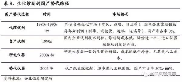 現(xiàn)今,化學(xué)發(fā)光的發(fā)展階段與2000年左右的生化市場相似,回顧生化市場的國產(chǎn)替代進程,可有一定的啟示作用。生化的發(fā)展首先從代理國外廠家的試劑開始,逐步自主研發(fā)試劑,此時促使國外廠家對其生化系統(tǒng)進行開放。而后逐步研發(fā)出生化儀器,對整個生化診斷進行替代。進程如下:
