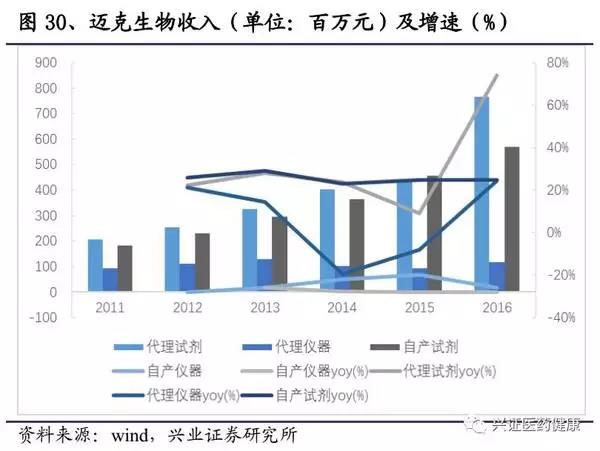 2、近幾年儀器的研發(fā)壁壘已基本突破,儀器性能已與進口相當(dāng),試劑的種類業(yè)已較為豐富,在穩(wěn)定性進一步提高之后,將迅速放量。