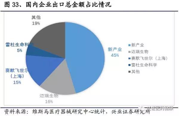 渠道能力強,國內(nèi)外銷售情況表現(xiàn)不俗。新產(chǎn)業(yè)采用經(jīng)銷為主,直銷為輔的模式進行銷售。在國內(nèi)市場,新產(chǎn)業(yè)終端用戶分布范圍廣,省份分散,覆蓋醫(yī)院3000多家。其中,二級醫(yī)院有1千多家,三級醫(yī)院近1千家,一級醫(yī)院較少。今后,一級醫(yī)院市場將被充分開發(fā),將通過自購或者區(qū)域檢驗中心的方式,將免疫檢測技術(shù)更新至化學(xué)發(fā)光法,市場空間巨大。在出口方面,儀器出口收入占到總收入近一半,試劑出口收入占到10%左右。2016年出口總額為國內(nèi)第一,占到總金額的45.6%。