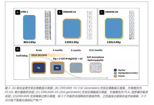 鎂是人體的必需元素,具有多種生理功能,與生命的維持、身體的健康有著極其密切的關(guān)系,因此可降解冠脈鎂合金支架研發(fā)處于可降解金屬支架的領(lǐng)先水平,以德國(guó)Biotronik 公司的鎂合金支架為代表, 前后經(jīng)歷了AMS、DREAMS 1G(drug-eluting absorbable metal scaffold 1 generation)和DREAMS 2G(drug-eluting absorbable metalscaffold 2 generation)三代支架(圖2),支架基體采用WE43 鎂合金材料[21]。AMS 為鎂合金裸支架,經(jīng)過(guò)PROGRESS 臨床實(shí)驗(yàn)顯示支架具有良好的安全性,且在新生兒體內(nèi)植入兩個(gè)AMS支架后,新生兒血清鎂含量處于正常水平,且不需要進(jìn)行二次手術(shù),但是降解速度太快徑向支撐力不足導(dǎo)致晚期管腔丟失現(xiàn)象嚴(yán)重,因此在該基礎(chǔ)上對(duì)鎂合金裸支架的成分和構(gòu)型進(jìn)行了更新,加粗了骨架尺寸,添加了一層載有紫杉醇藥物的可降解PLGA 高分子涂層,從而增強(qiáng)了支架支撐力,減少內(nèi)膜增生以及降低降解速率,研發(fā)出了DREAMS 1G[22-24]。