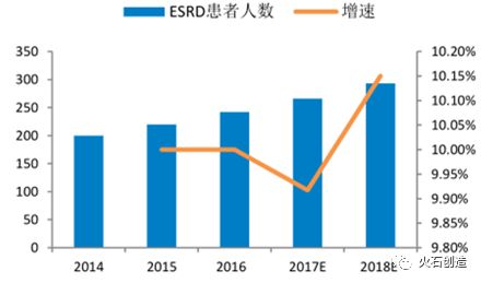 慢性腎病發(fā)展到5期,就進入了終末期腎病階段,隨著腎功能的下降,最終引發(fā)尿毒癥的各種癥狀。據(jù)統(tǒng)計,2014年和2015年我國終末期腎病患者人數(shù)分別達到200萬人和220萬人,預(yù)計2018年將達到293萬人,四年復(fù)合年增長率達到10.02%。