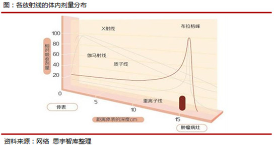 相較傳統(tǒng)的放射方式(γ射線、X射線),質子的劑量學優(yōu)勢更加明顯,其具備明顯而獨特的深度劑量特征。其獨特的布拉格峰可使得質子束在射入病灶前不釋放出強大的能量,達到病灶末端時能量幾乎剛好釋放完畢,充分保護了腫瘤病灶前后的正常組織。這種特性使得質子重離子相對其它射線天然地更為適合用于放療。